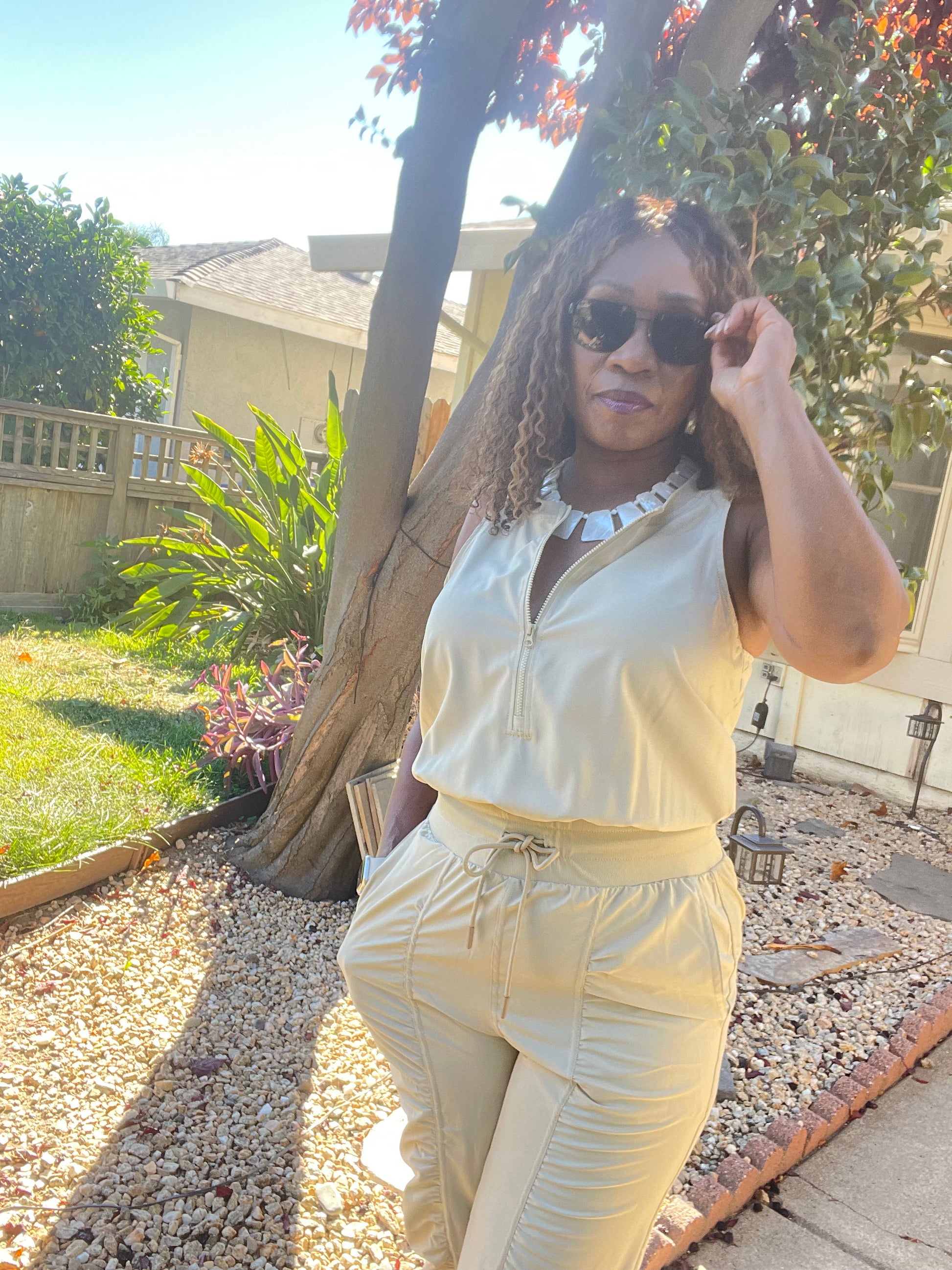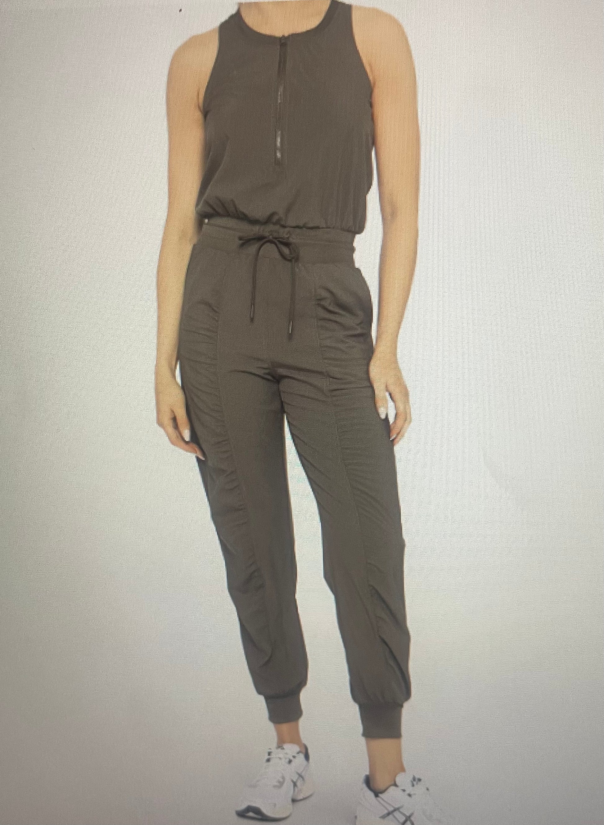 This trek-ready jumpsuit is the perfect combination of sporty and streetwear. Made from a lightweight woven fabric, this jumpsuit features a rib waistband and jogger cuff for an optimize fit, front detail on the pant legs and adjustable draw cord at the waist, side pockets, and a half zip at the neck line.